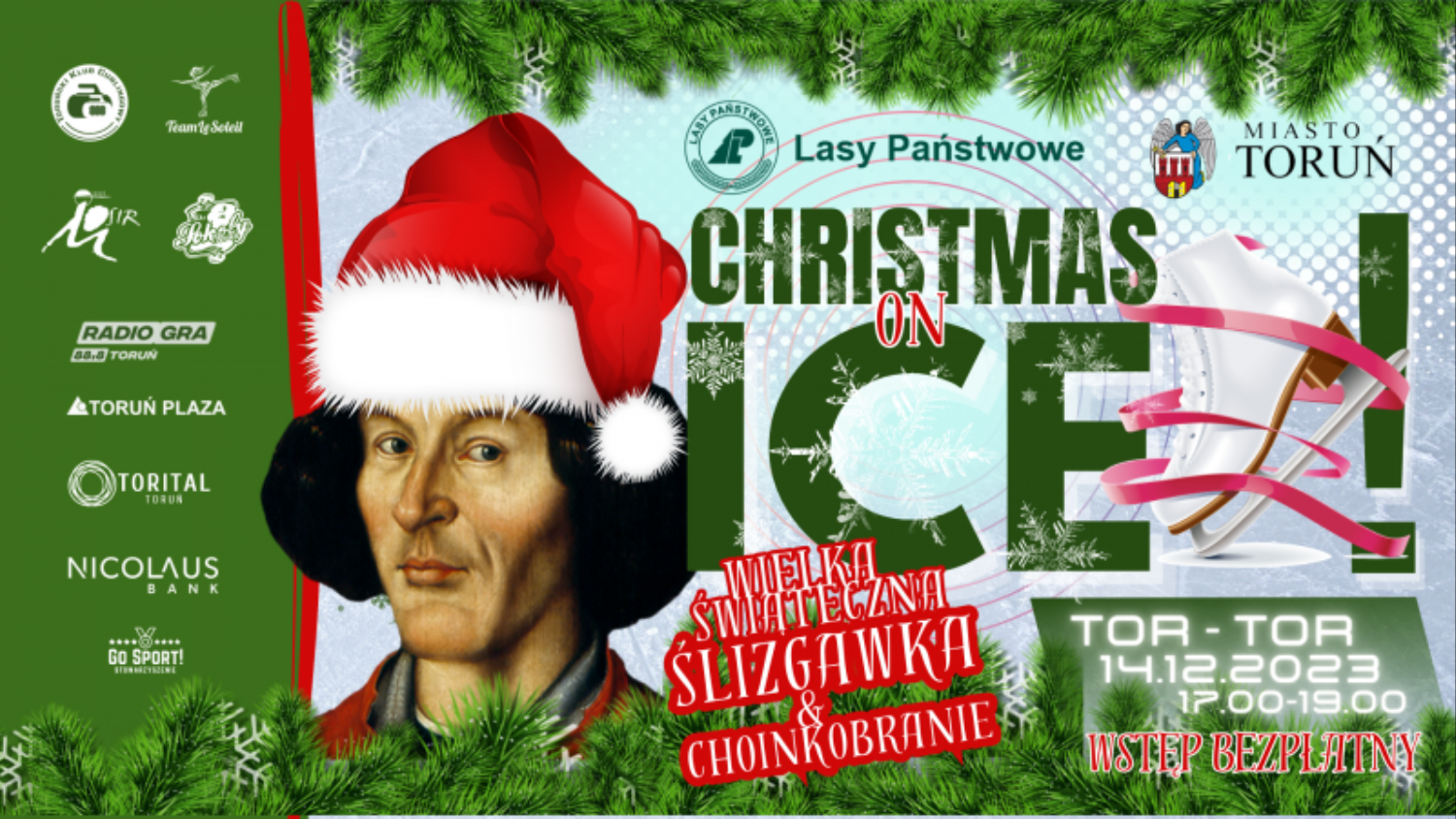 Miasto Toruń, Nadleśnictwo Toruń, Radio GRA, MOSiR i Stowarzyszenie GOSPORT! zapraszają na Wielką Toruńską Świąteczną Ślizgawkę - CHRISTMAS ON ICE. Ślizgamy się na Tor-Torze z Mikołajem Kopernikiem 14 grudnia 2023.